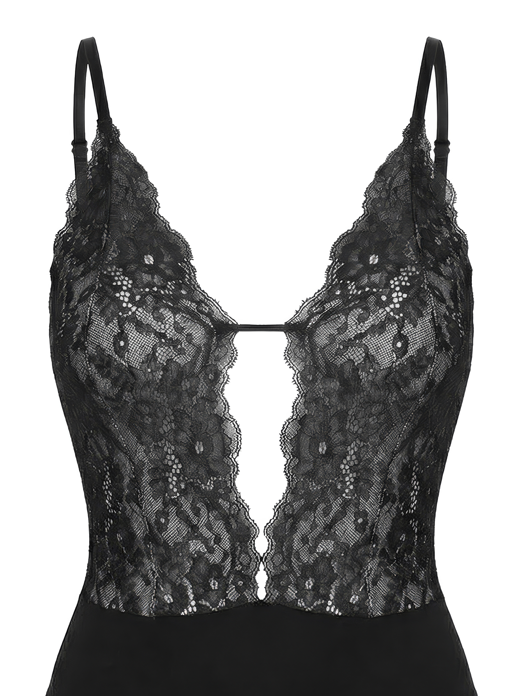 Отличается более глубоким V-вырезом и удлиненным по талии кружевным лифом на телесной подкладке, который мягко подчёркивает линию декольте.