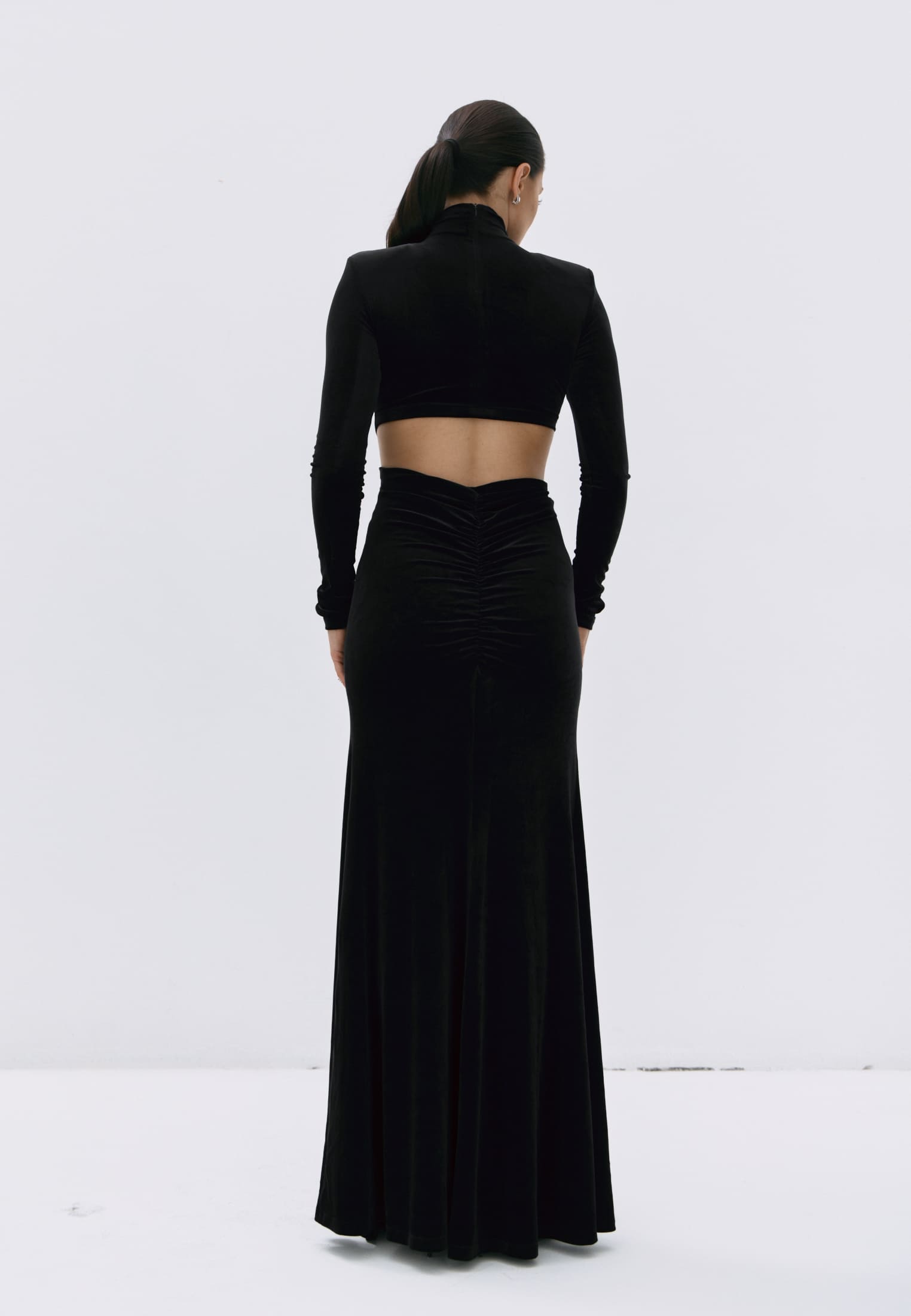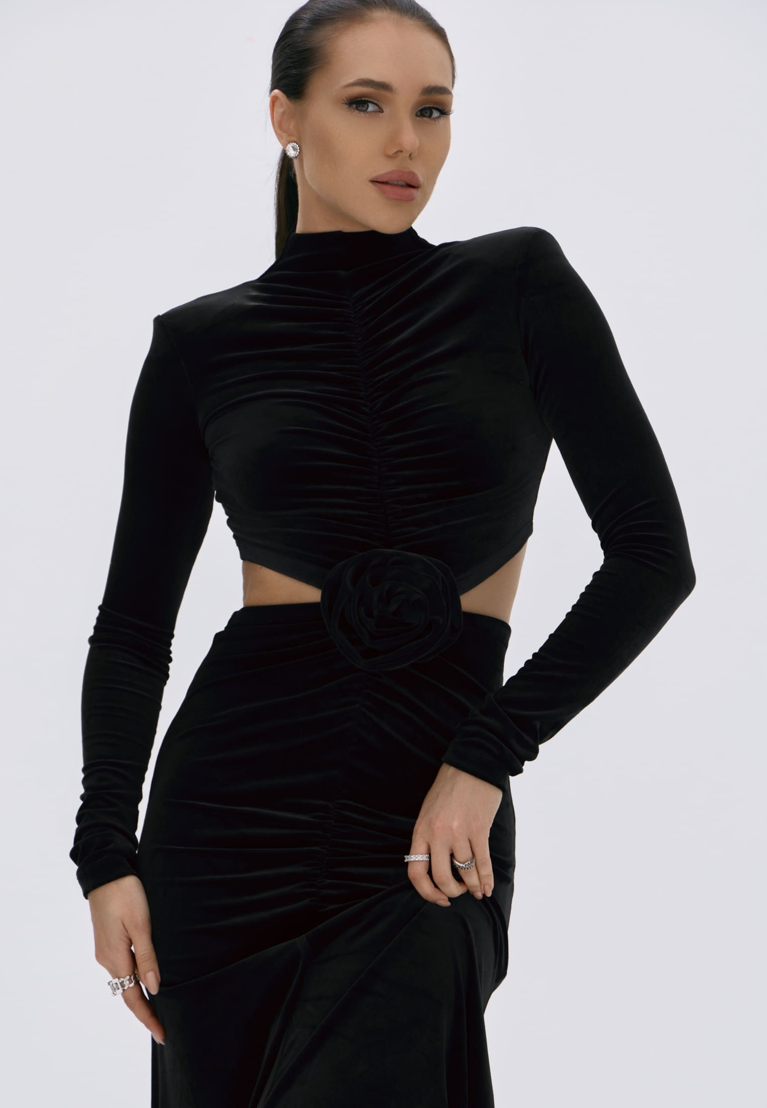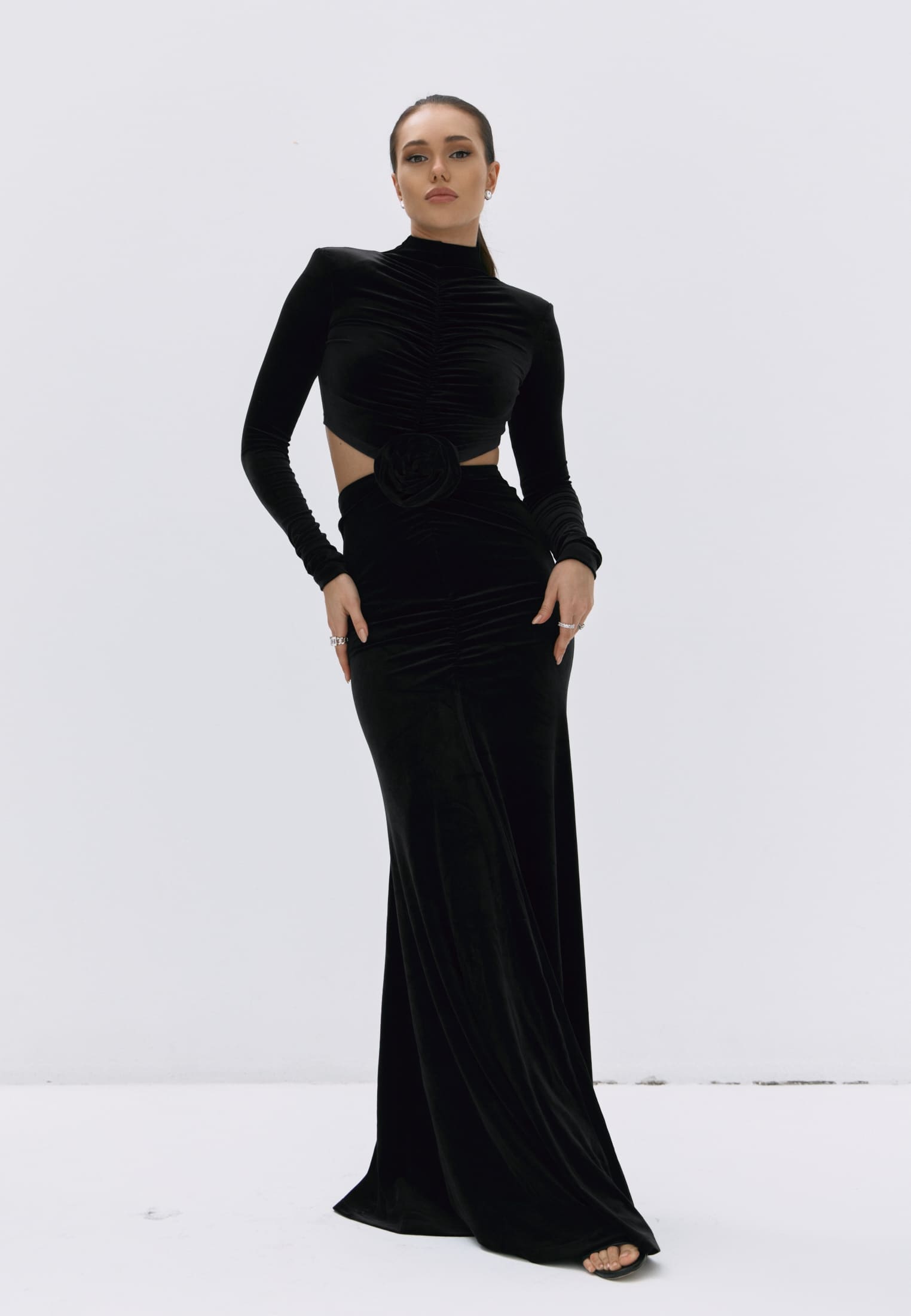 Гладкий черный бархат мягко обнимает фигуру, создавая элегантный силуэт и утончённые акценты на талии.