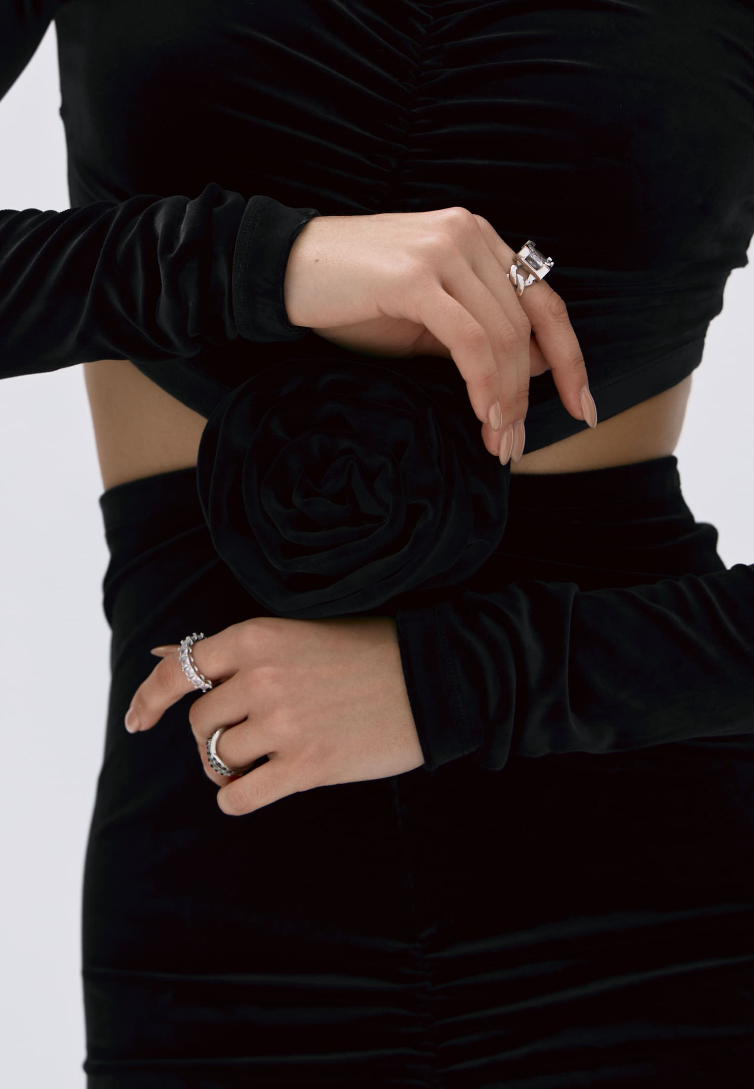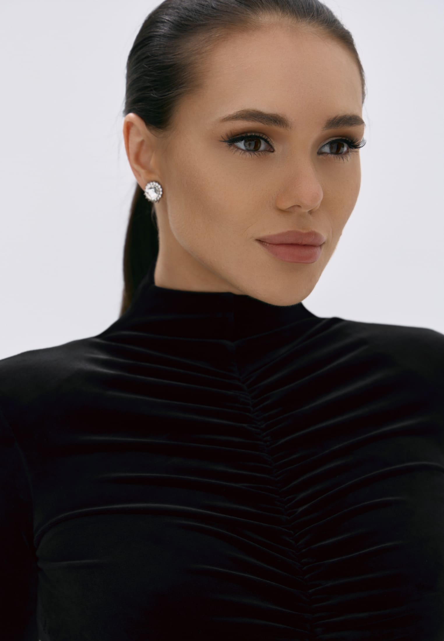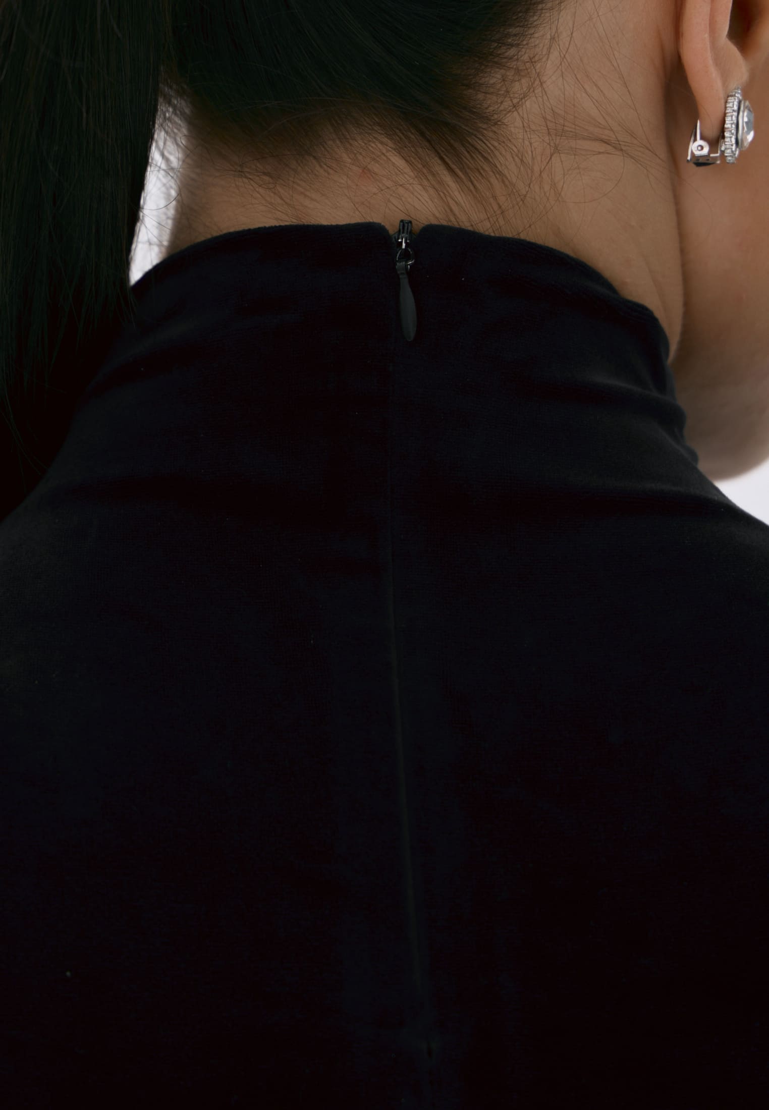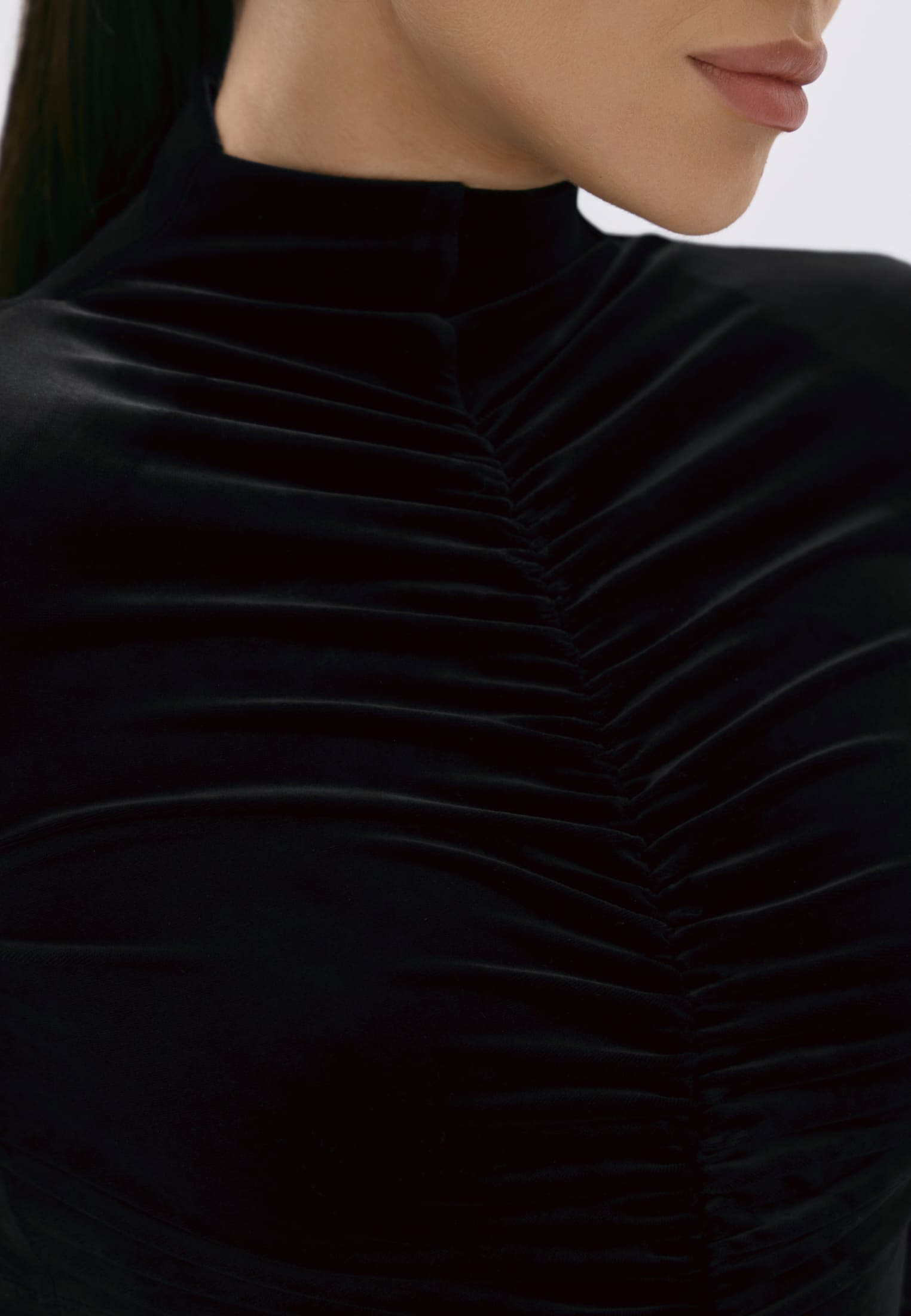 Гладкий черный бархат мягко обнимает фигуру, создавая элегантный силуэт и утончённые акценты на талии.