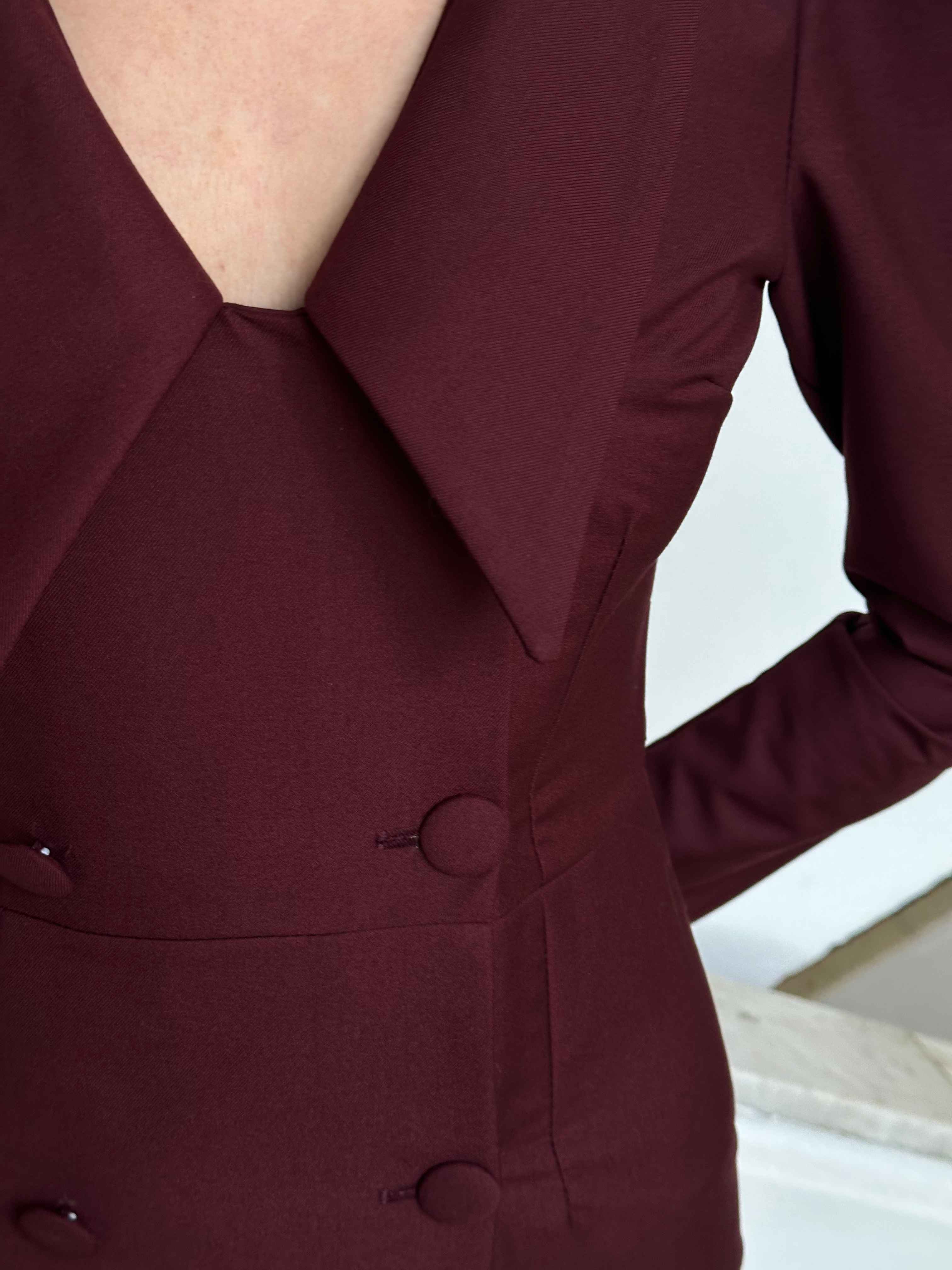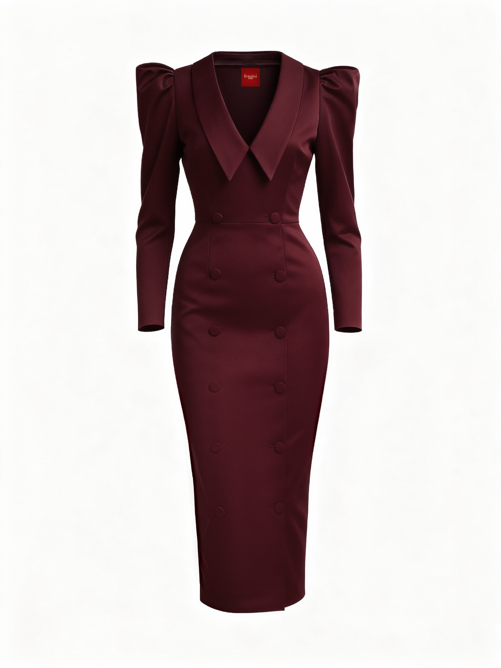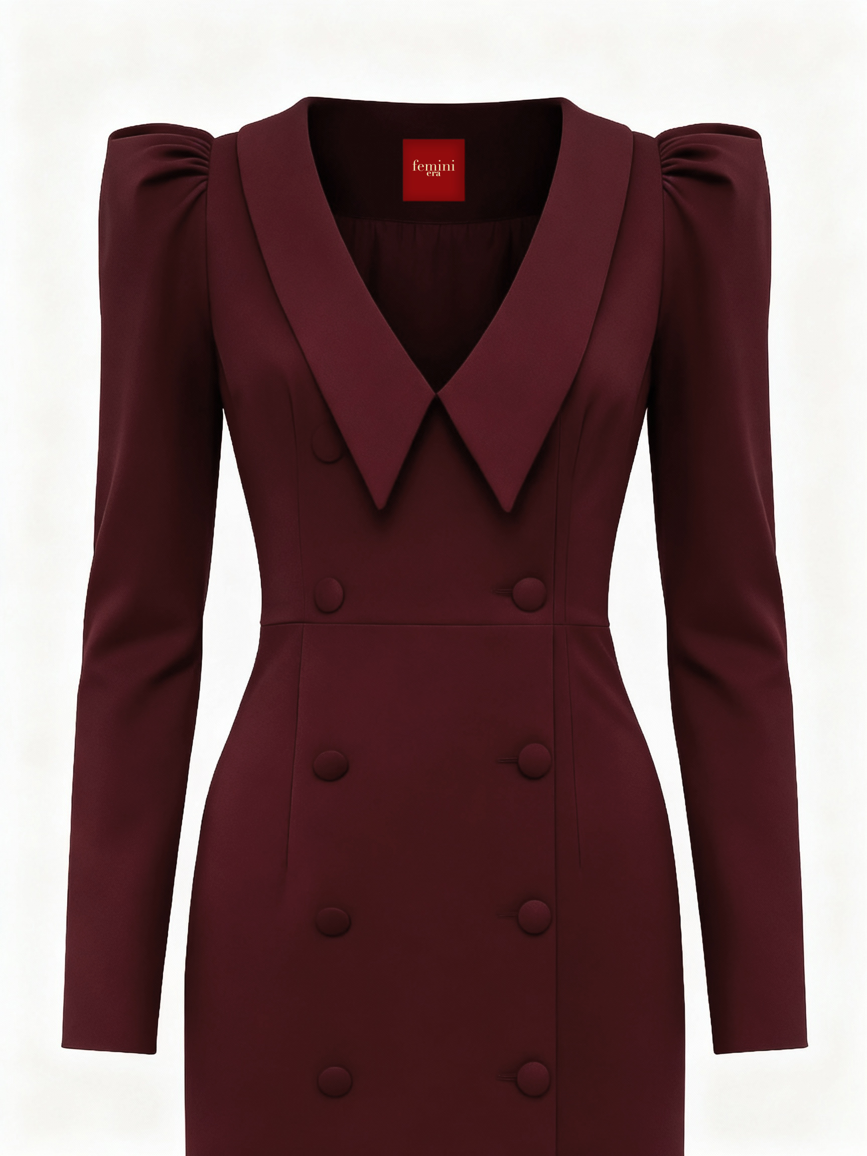 Приталенный крой и вертикальный удлиненный ряд обтяжных пуговиц визуально вытягивают фигуру, делая образ утончённым и уверенным.
