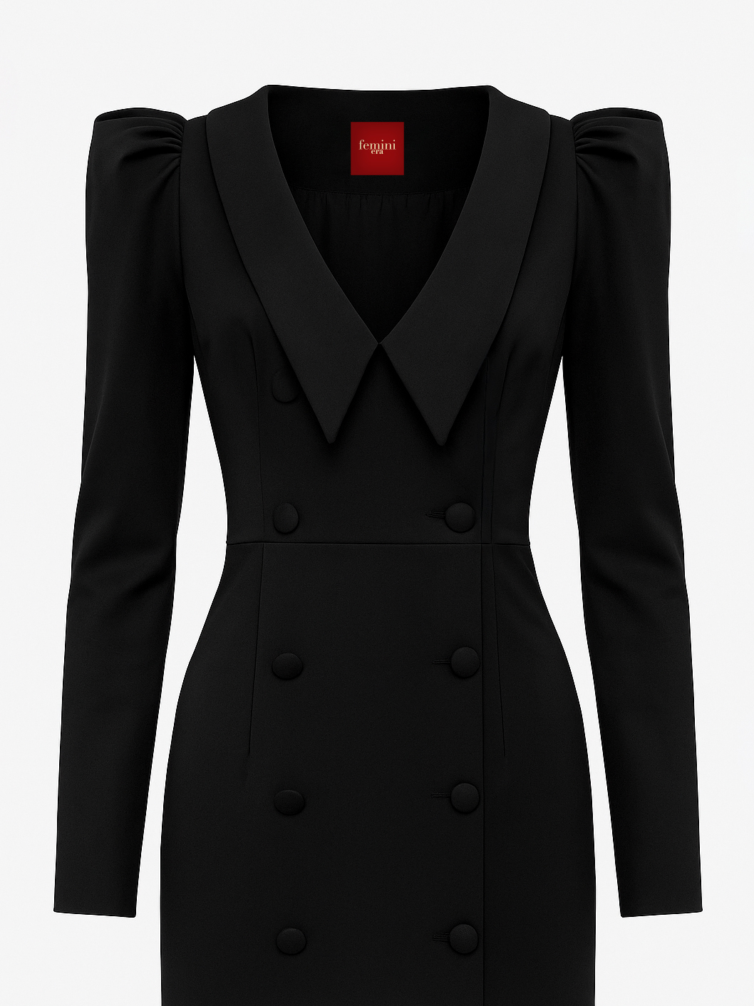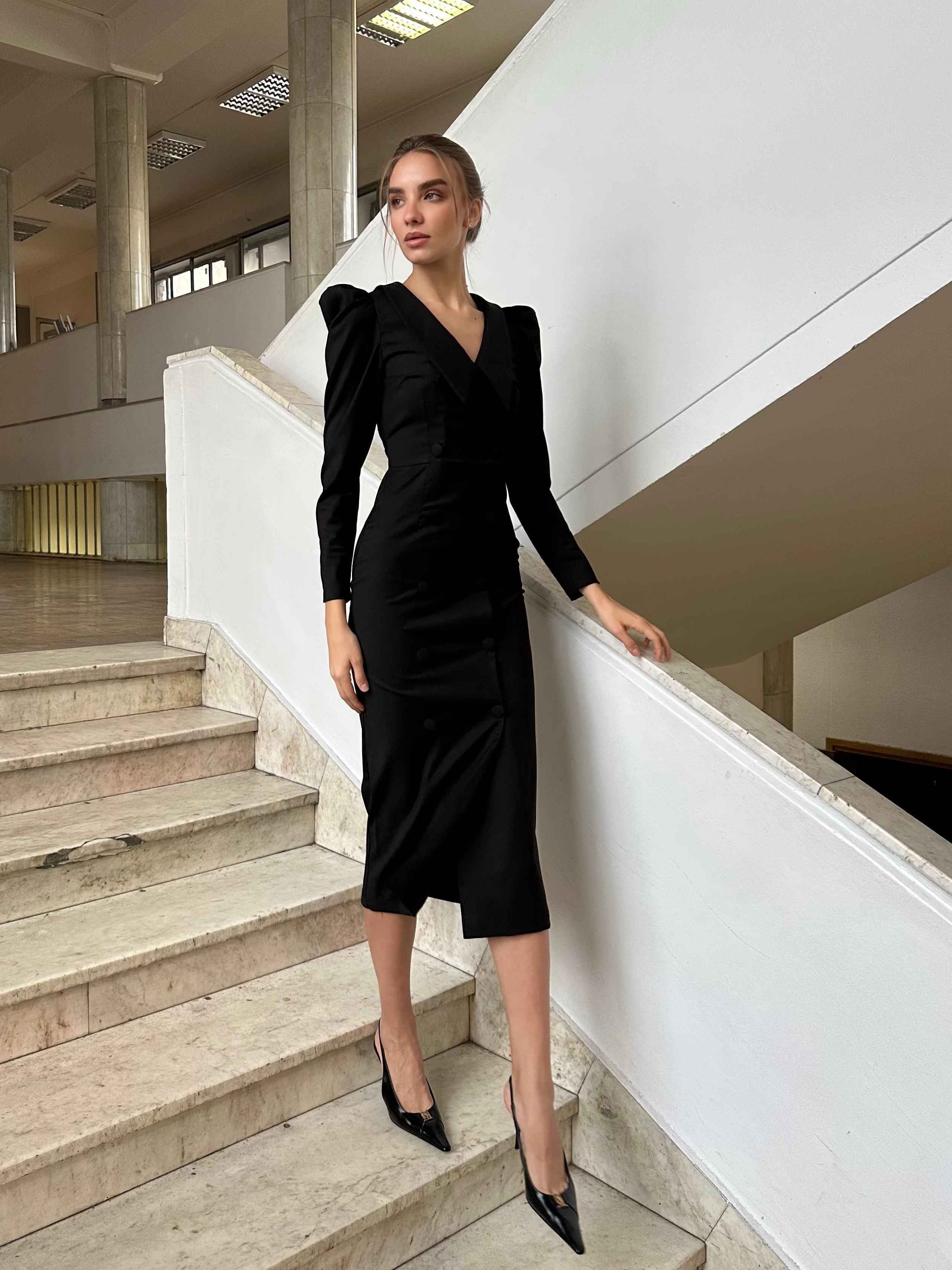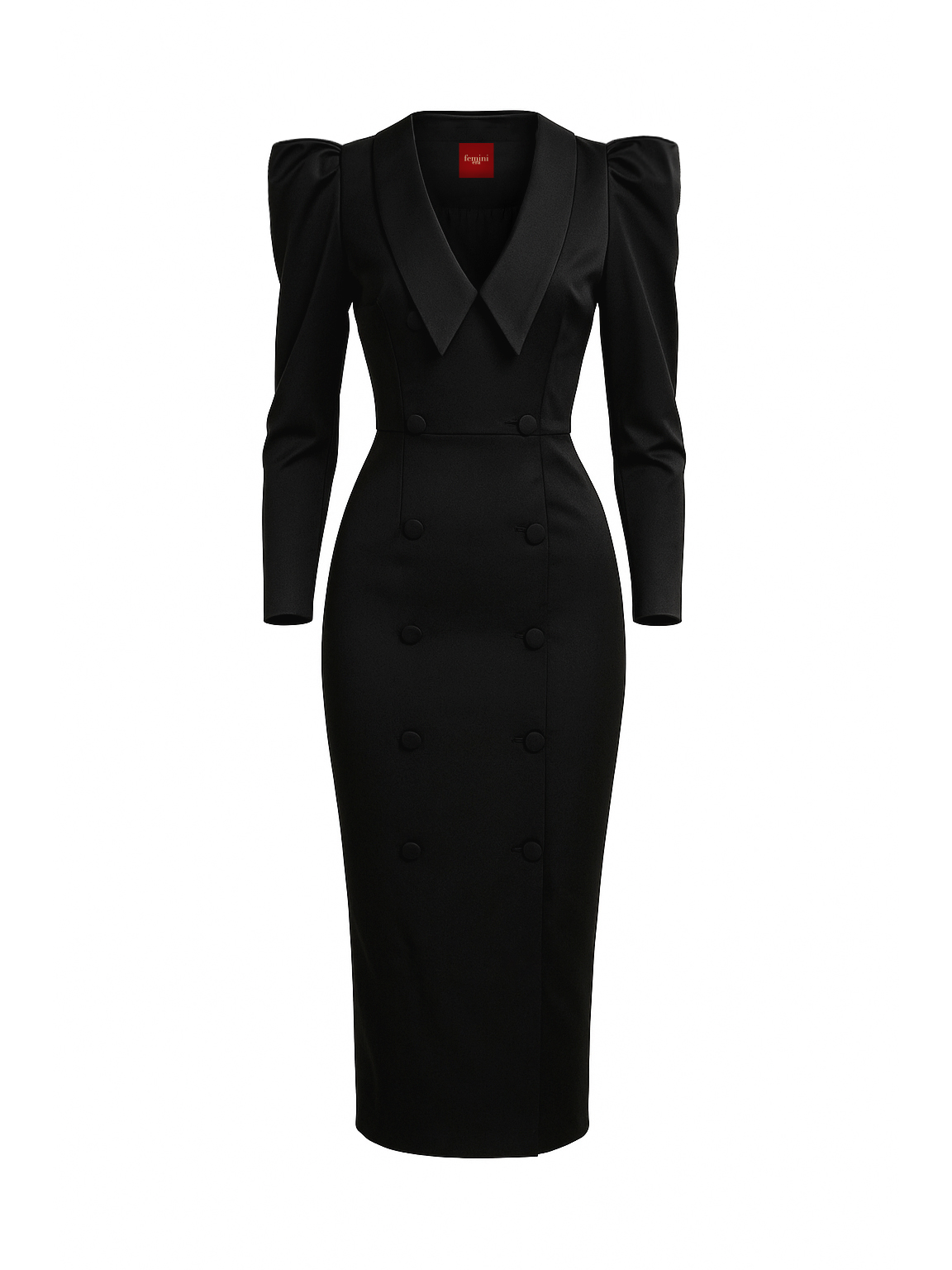 Приталенный крой и вертикальный удлиненный ряд обтяжных пуговиц визуально вытягивают фигуру, делая образ утончённым и уверенным.