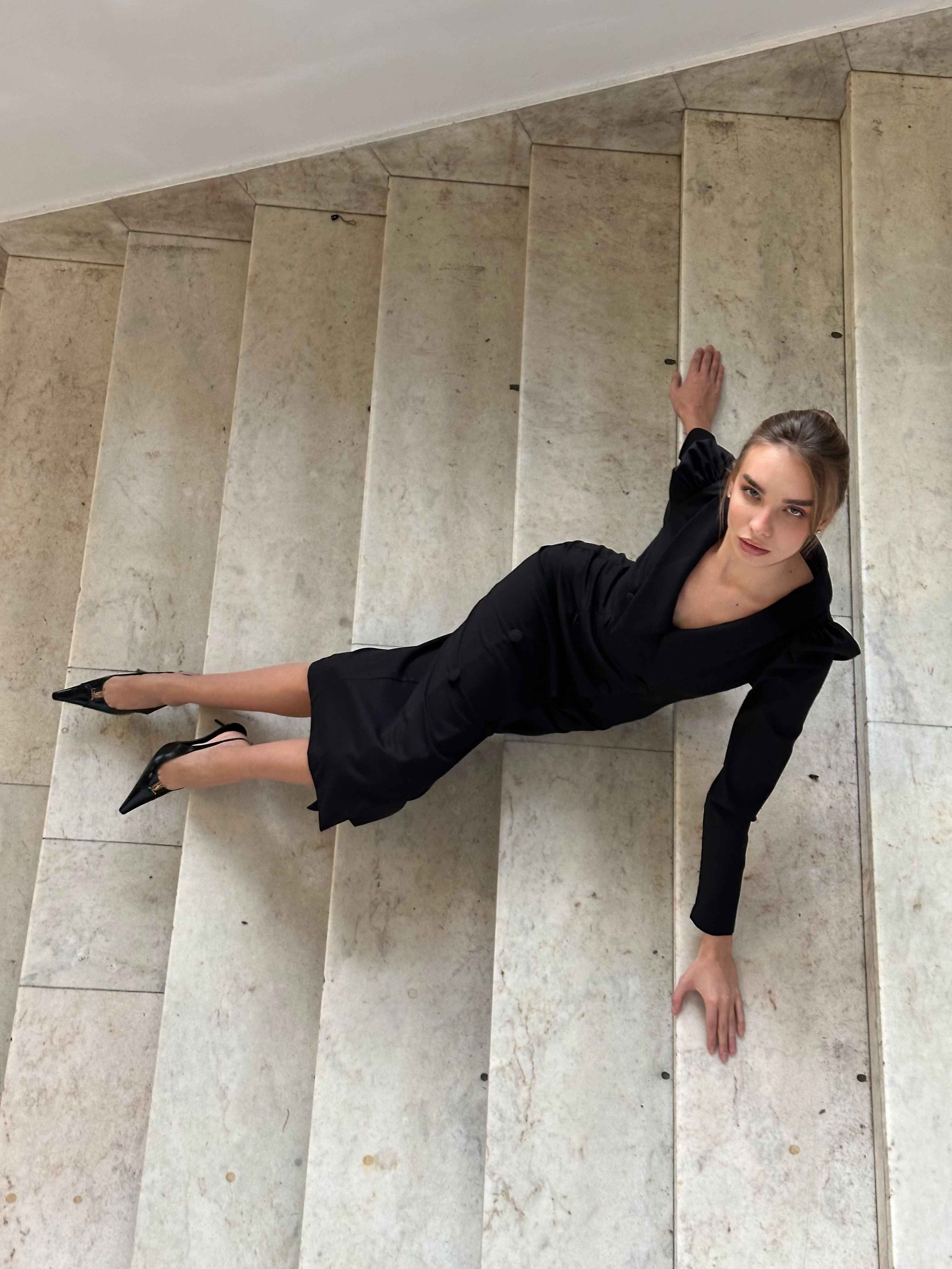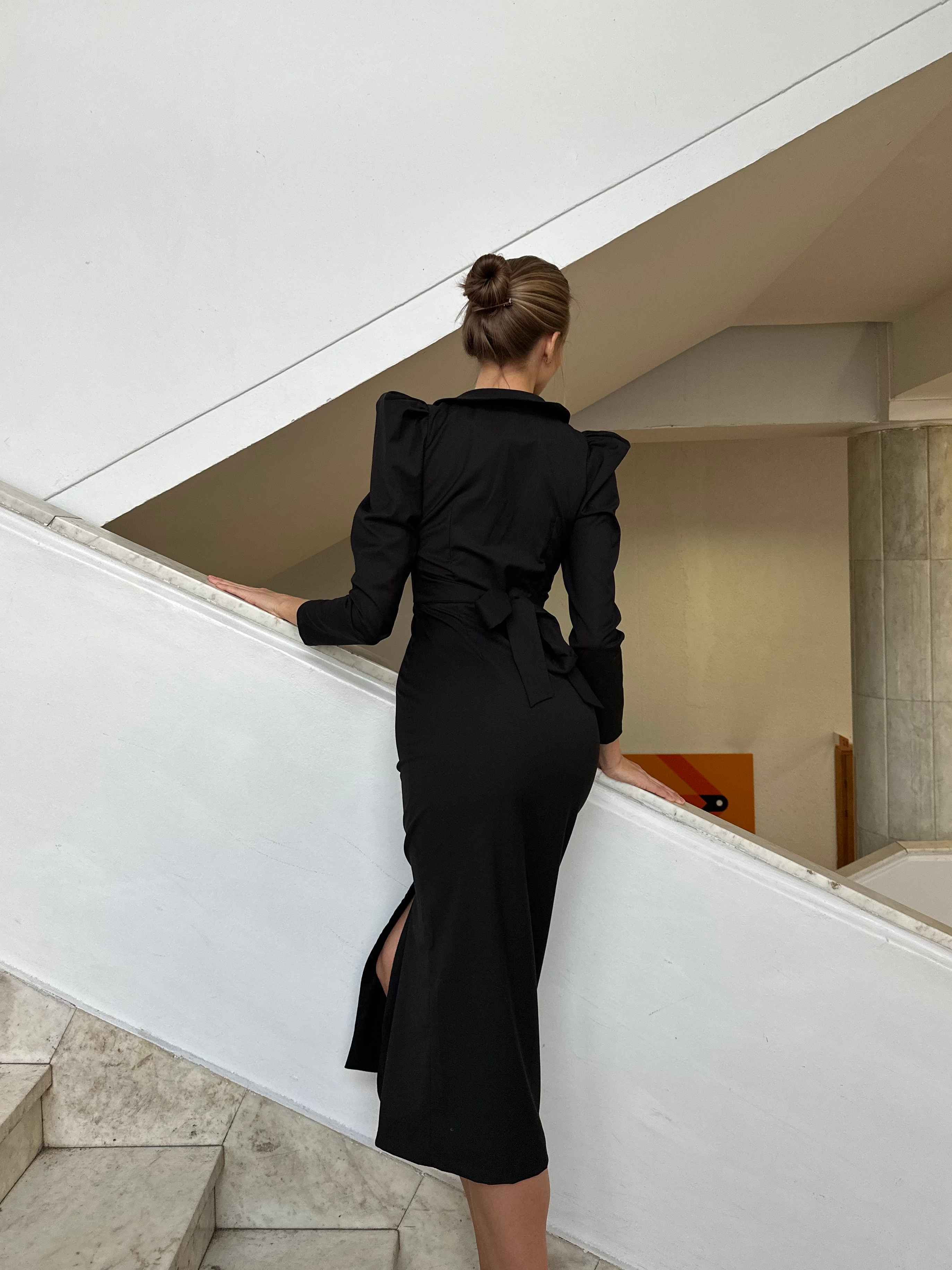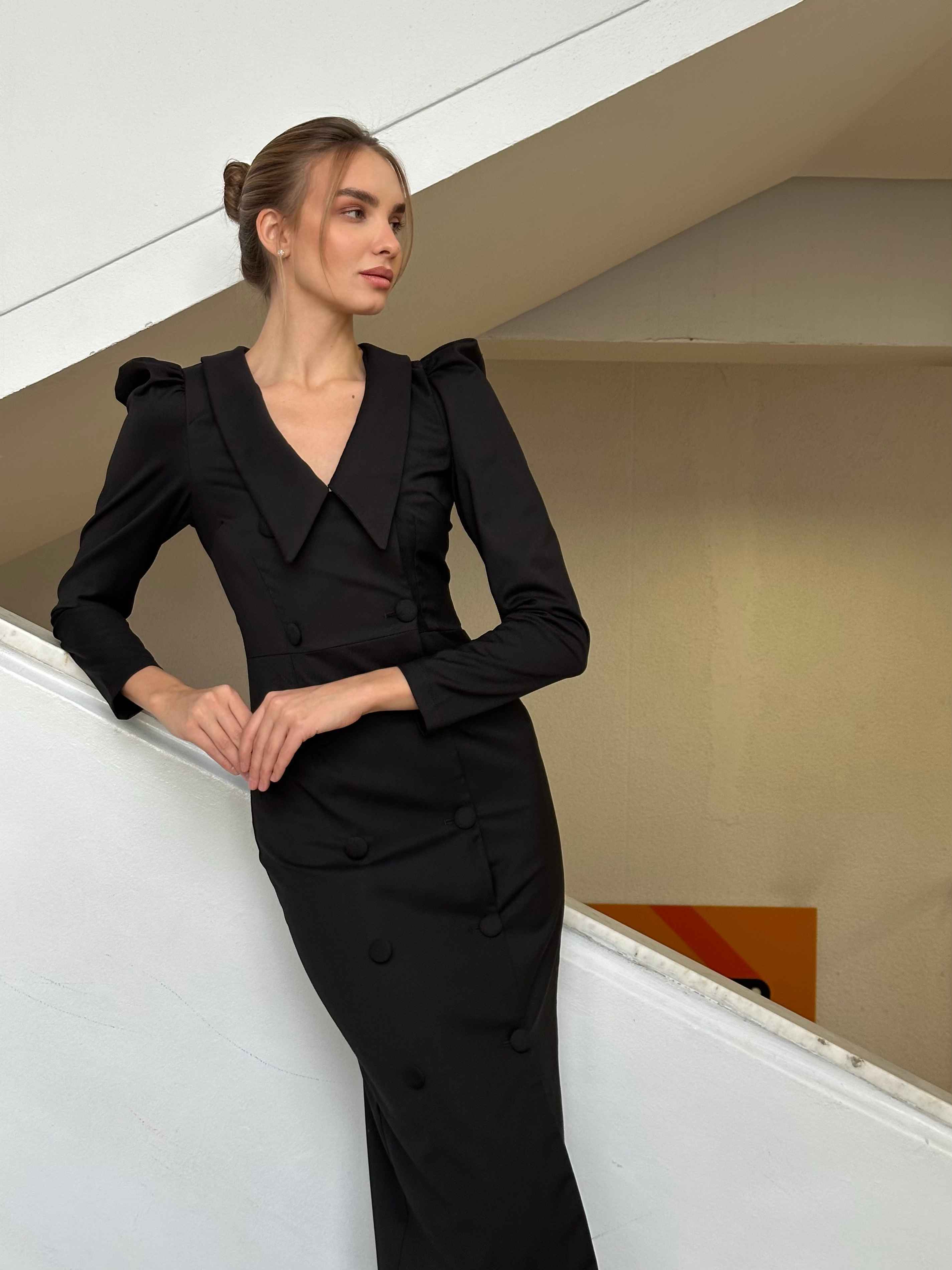 Приталенный крой и вертикальный удлиненный ряд обтяжных пуговиц визуально вытягивают фигуру, делая образ утончённым и уверенным.