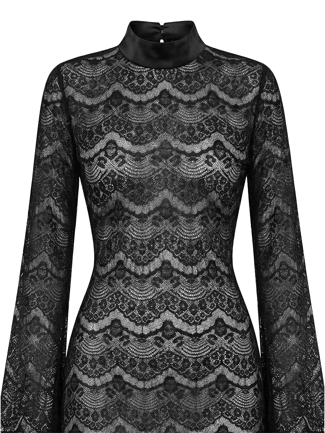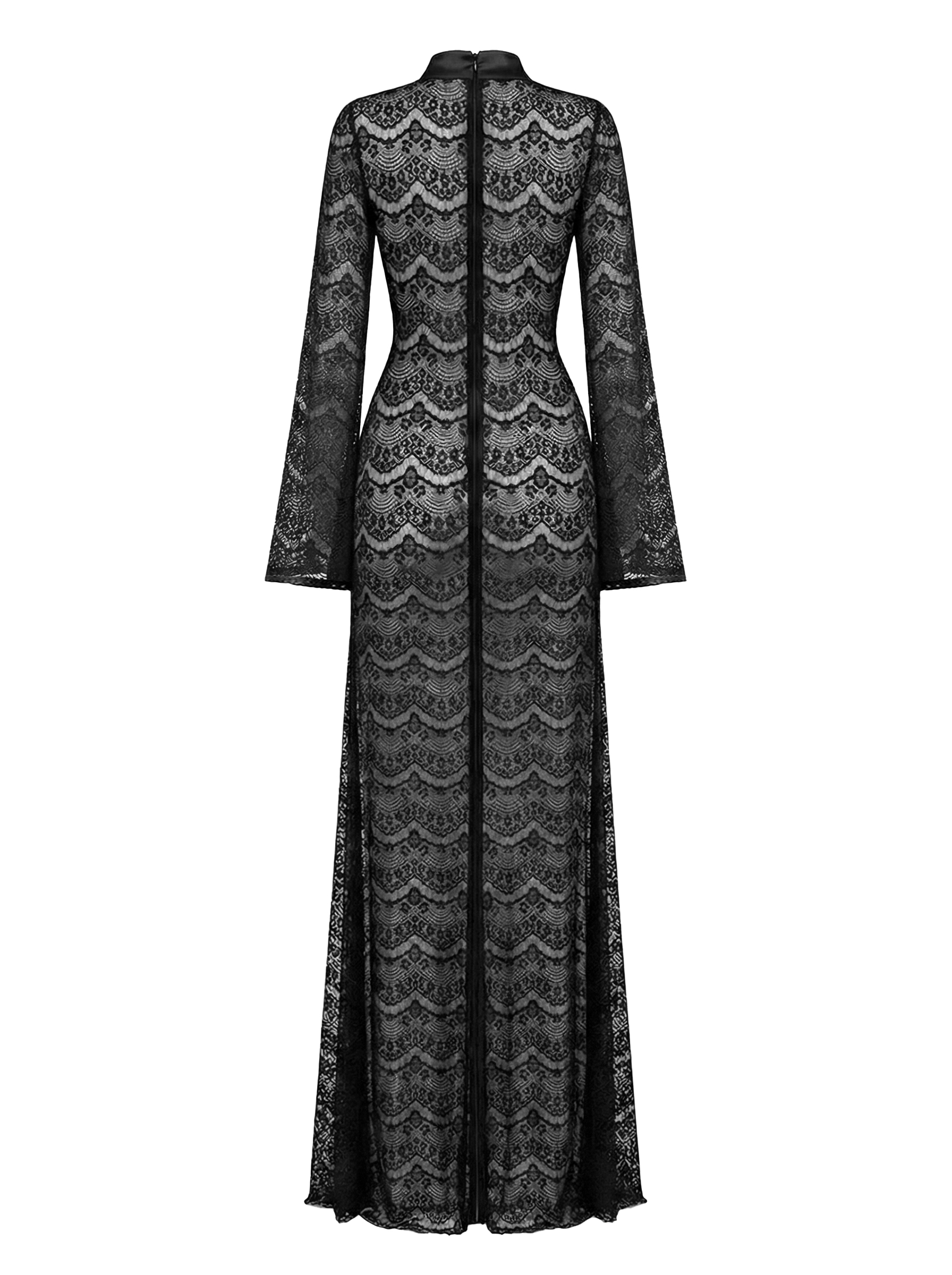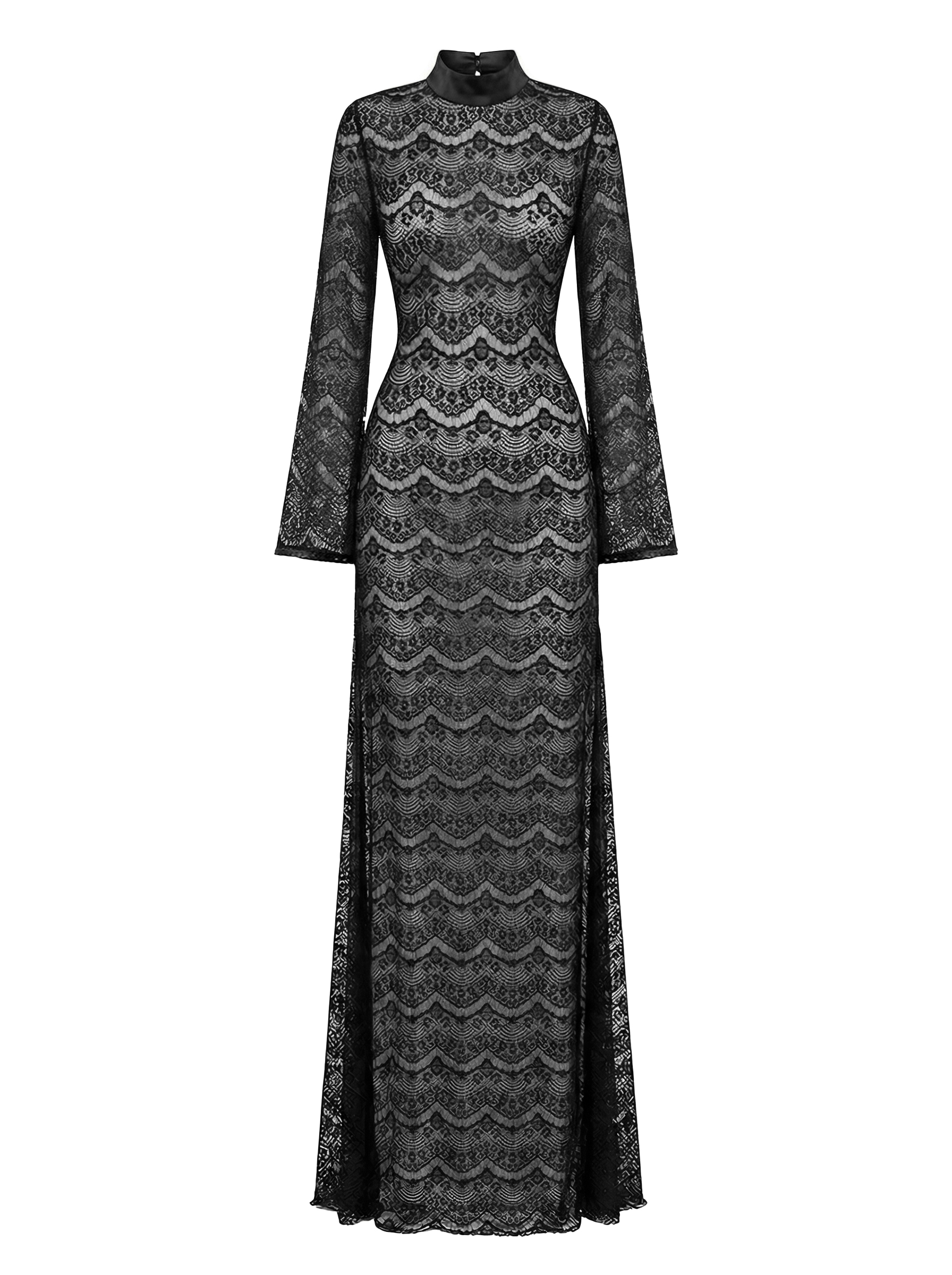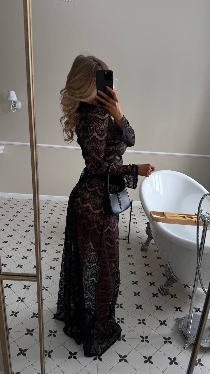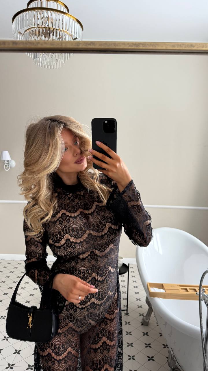 Длинное кружевное платье full naked (плностью голое) с чистым, вытянутым силуэтом. Полупрозрачная текстура мягко ложится по фигуре, создавая глубину и игру света, но образ остаётся собранным и аккуратным. Высокий ворот и длинные рукава уравновешивают прозрачность, добавляя графичности. Линия талии подчеркнута естественно, без жёстких конструкций — ткань просто следует за телом. Подойдёт для вечера, камерных событий или тех дней, когда хочется выглядеть тонко и по-взрослому.
