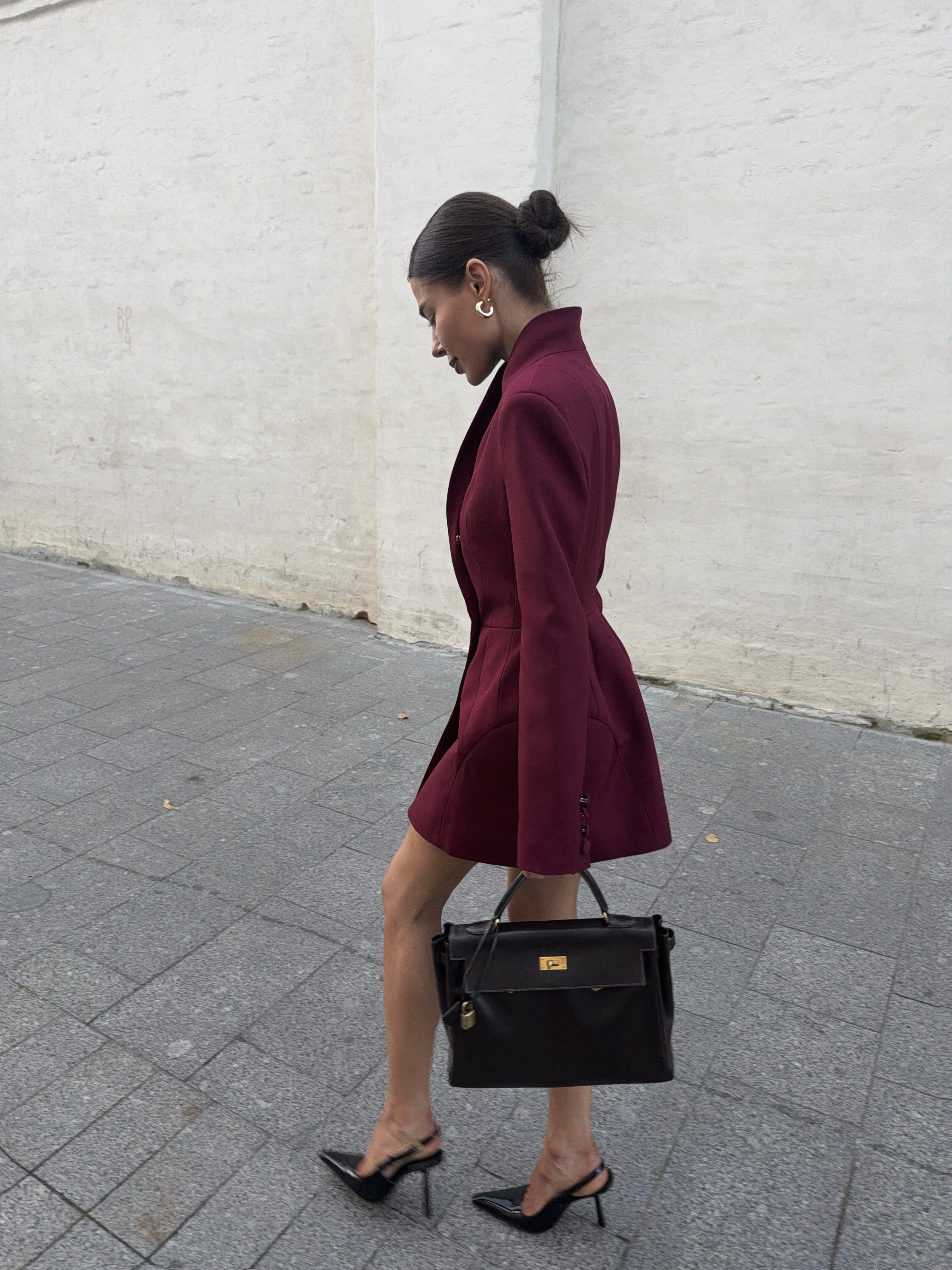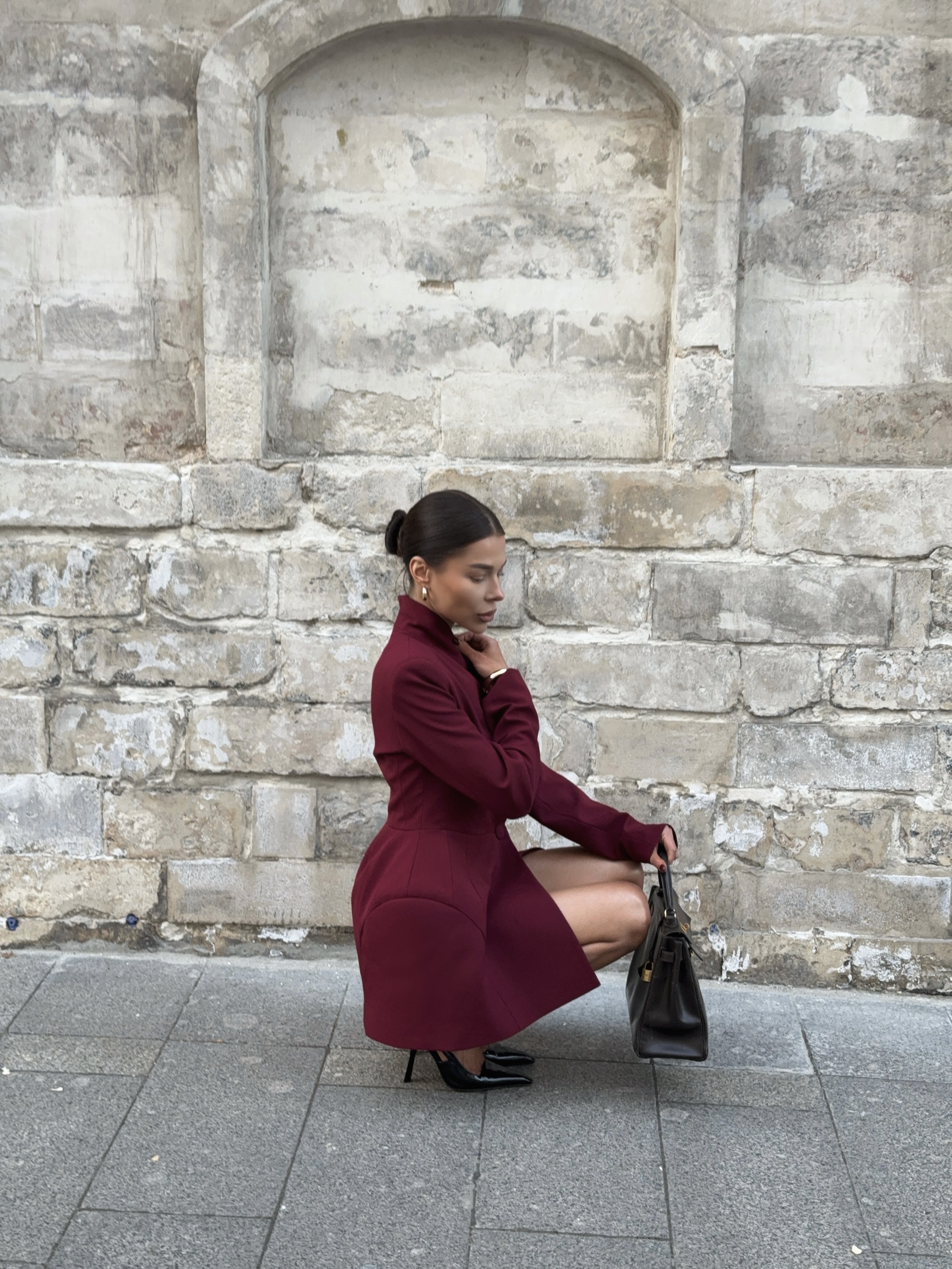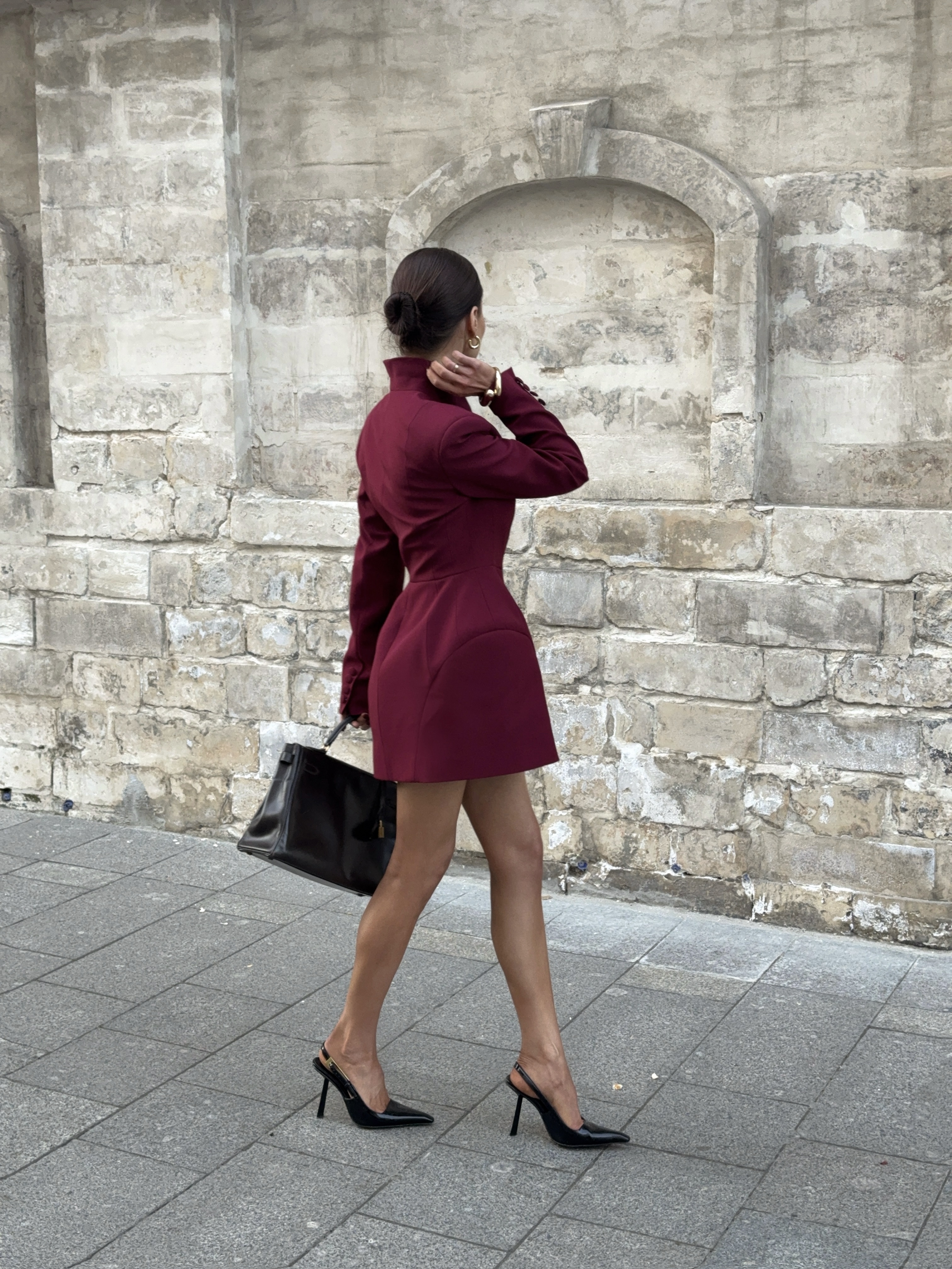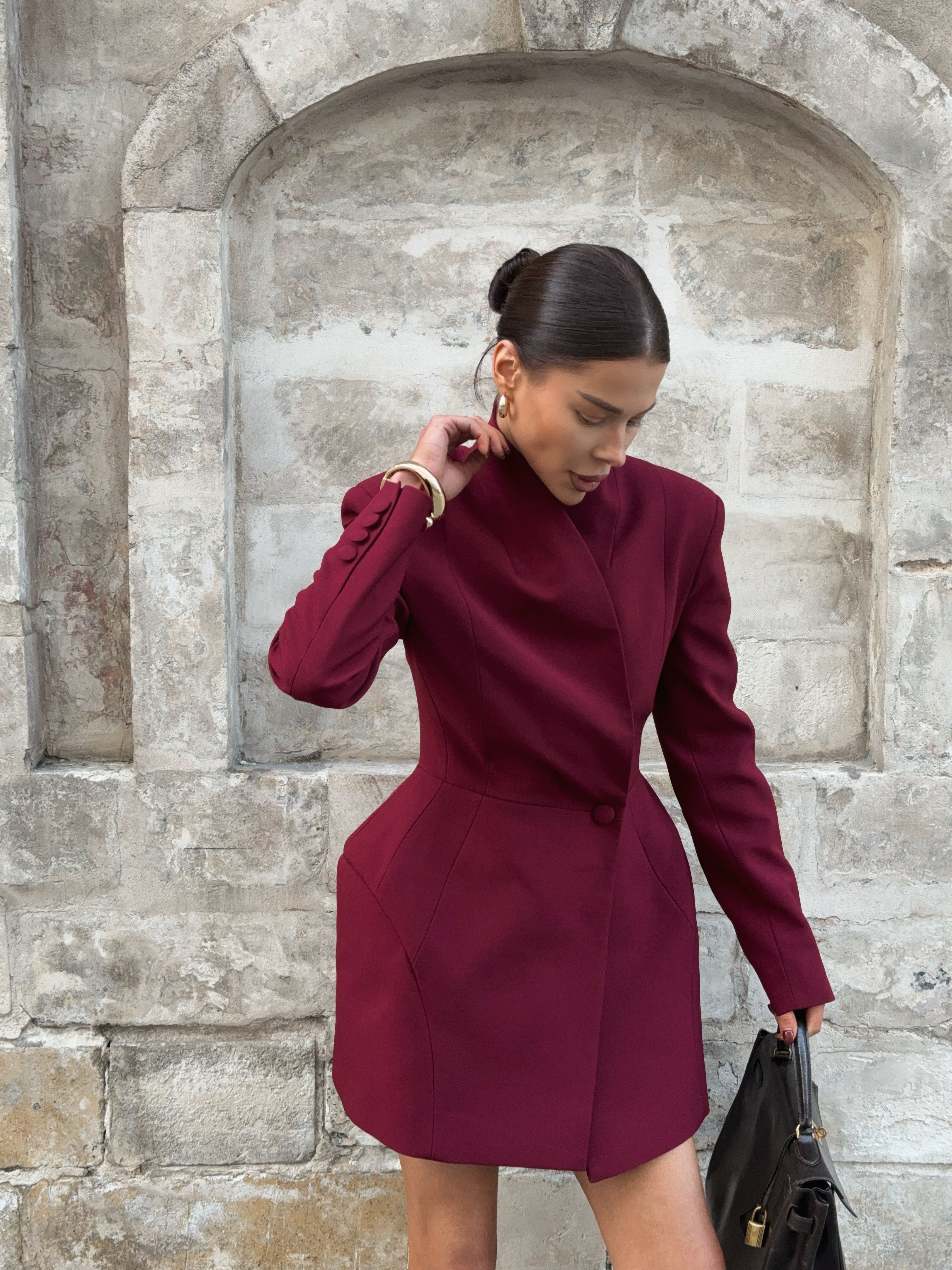 Глубокий винный оттенок и скульптурный крой делают этот жакет-платье центром образа. Он подчёркивает силу и женственность, идеально для вечера в городе или деловой встречи с акцентом.