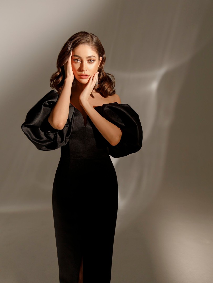 Роскошное платье длины миди с акцентным вырезом. Пышные рукава-фонарики и подчеркнутый силуэт - что еще нужно для выхода в свет?