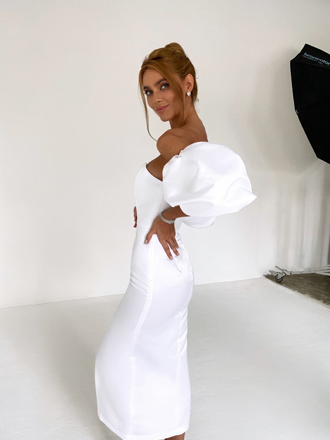 Роскошное платье длины миди с акцентным вырезом. Пышные рукава-фонарики и подчеркнутый силуэт - что еще нужно для выхода в свет?