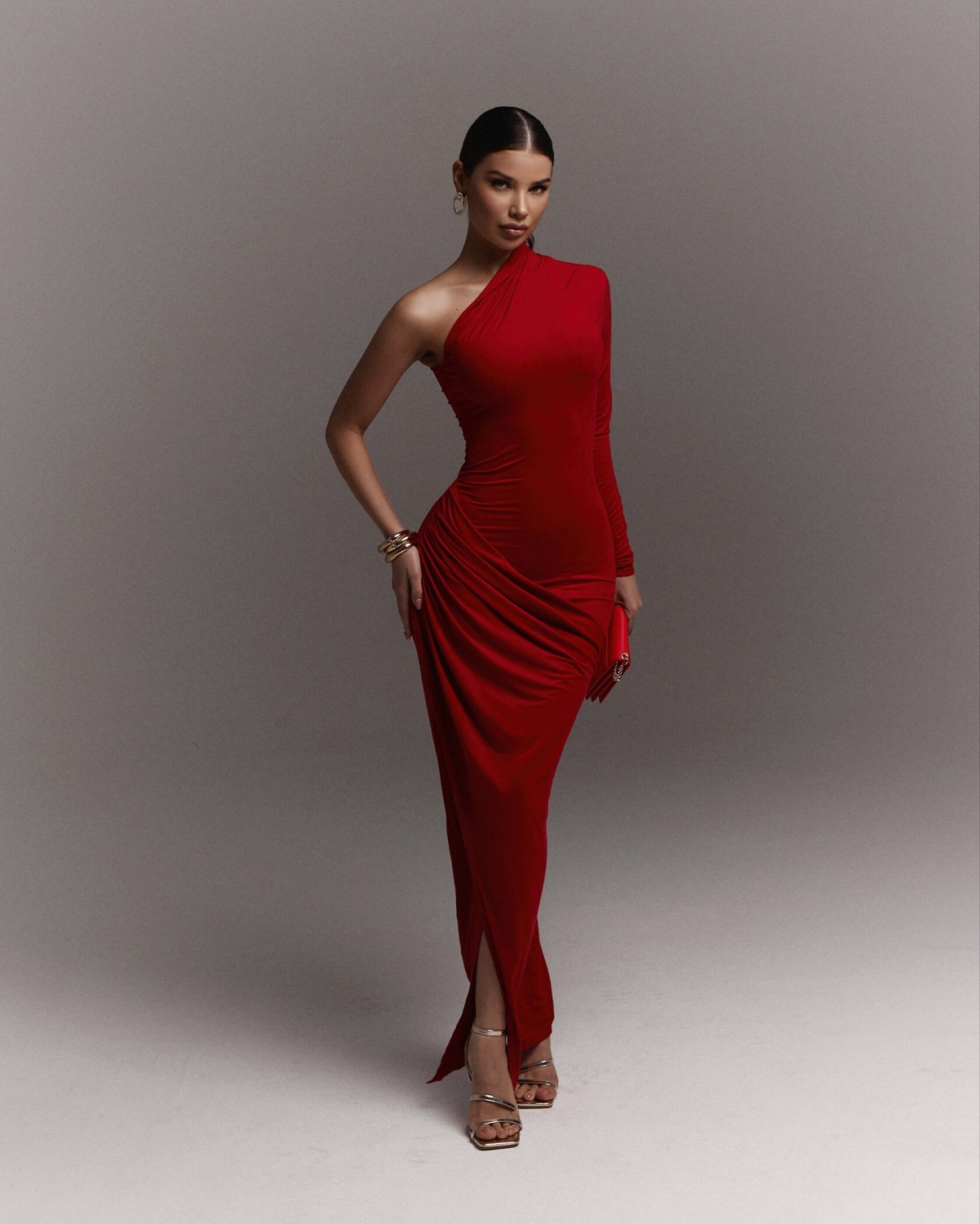 Красный цвет платья придает ему особую привлекательность и шарм, а также позволяет легко сочетать его с различными аксессуарами и обувью.