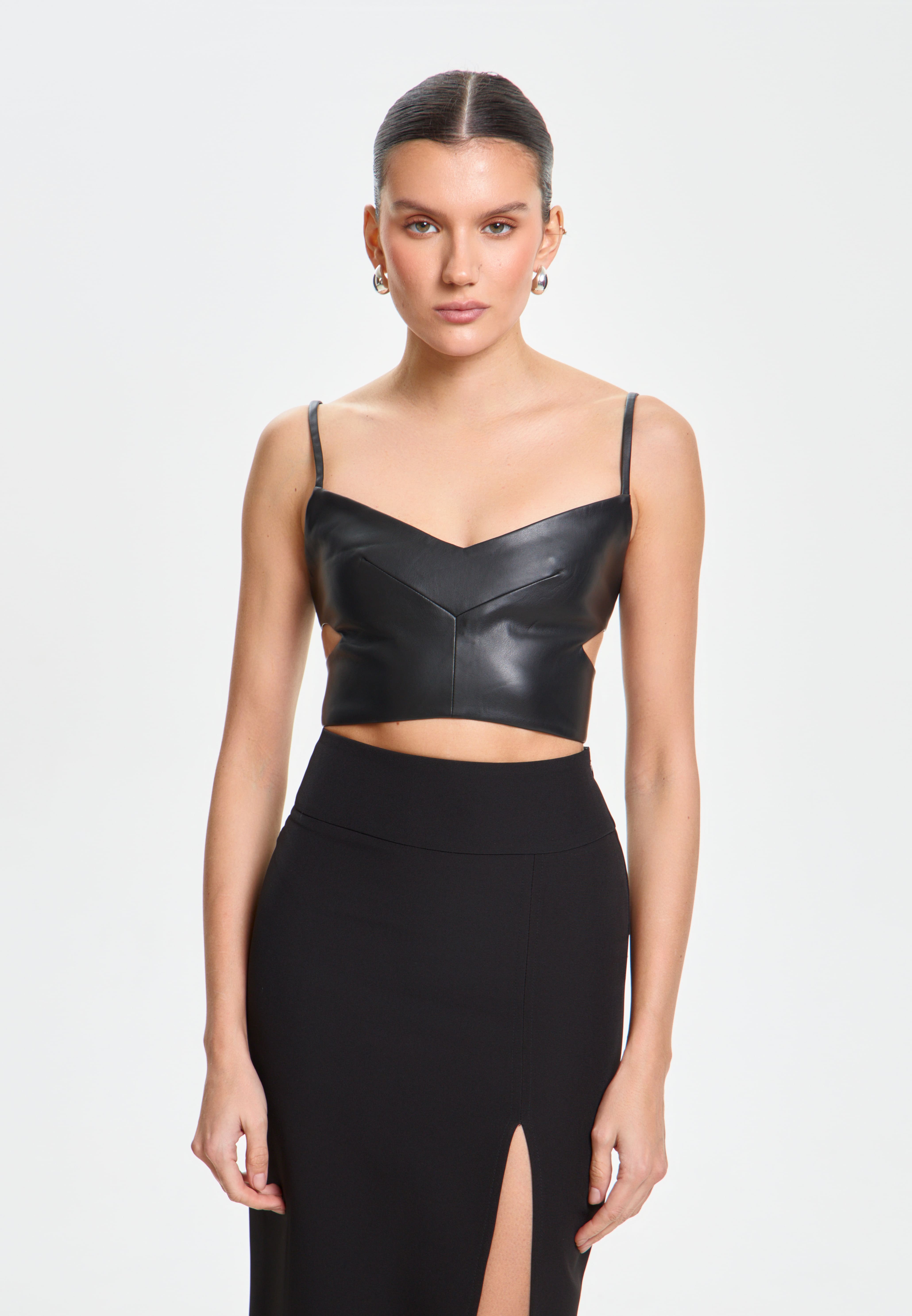 Укороченный топ из премиальной эко-кожи на бретелях. Идеальная посадка и вырезы по бокам - топ Джесси добавит вашему образу оригинальности и сексуальности