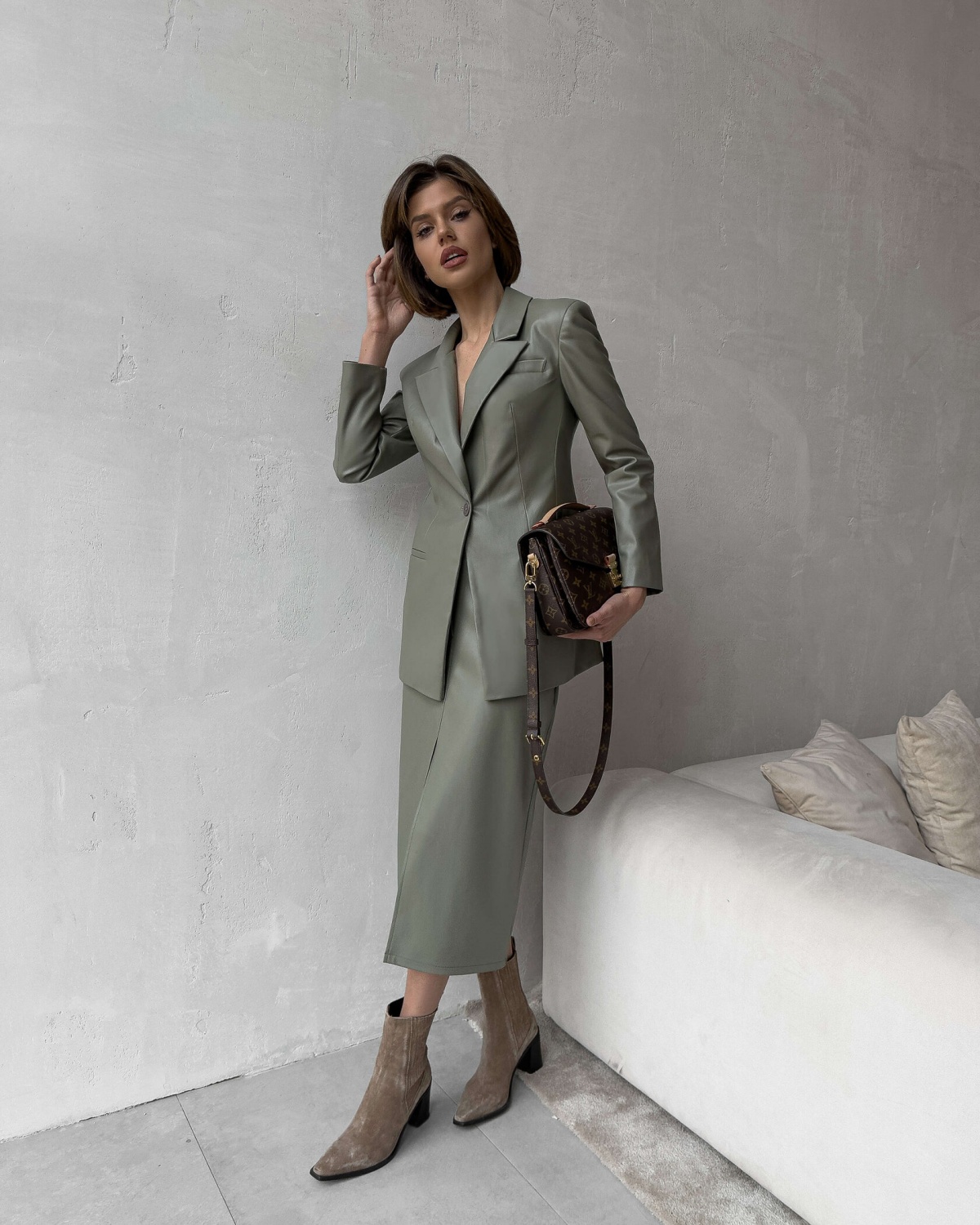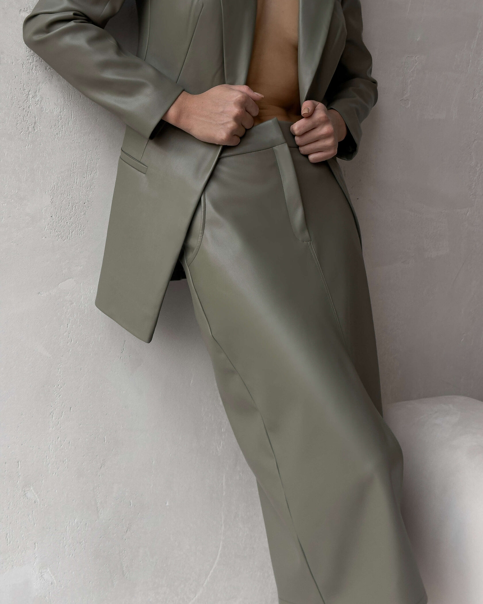 Юбка Тайра на высокой посадке из эко кожи в оливковом цвете - это стильный и модный элемент женского гардероба, который привлекает внимание своей элегантностью и утонченностью. Она создает идеальную силуэтную линию благодаря своей высокой посадке, которая подчеркивает талию и вытягивает ноги.